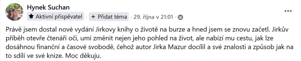 Napsal jsem pro Vás knihy ŽIVOT NA BURZE a JAK NA INVESTICE díky kterým získáte zkratku na peníze a vysněný život. Kniha je ze života, z praxe, doložená fakty. Bez příkras, napřímo a pravdivě!