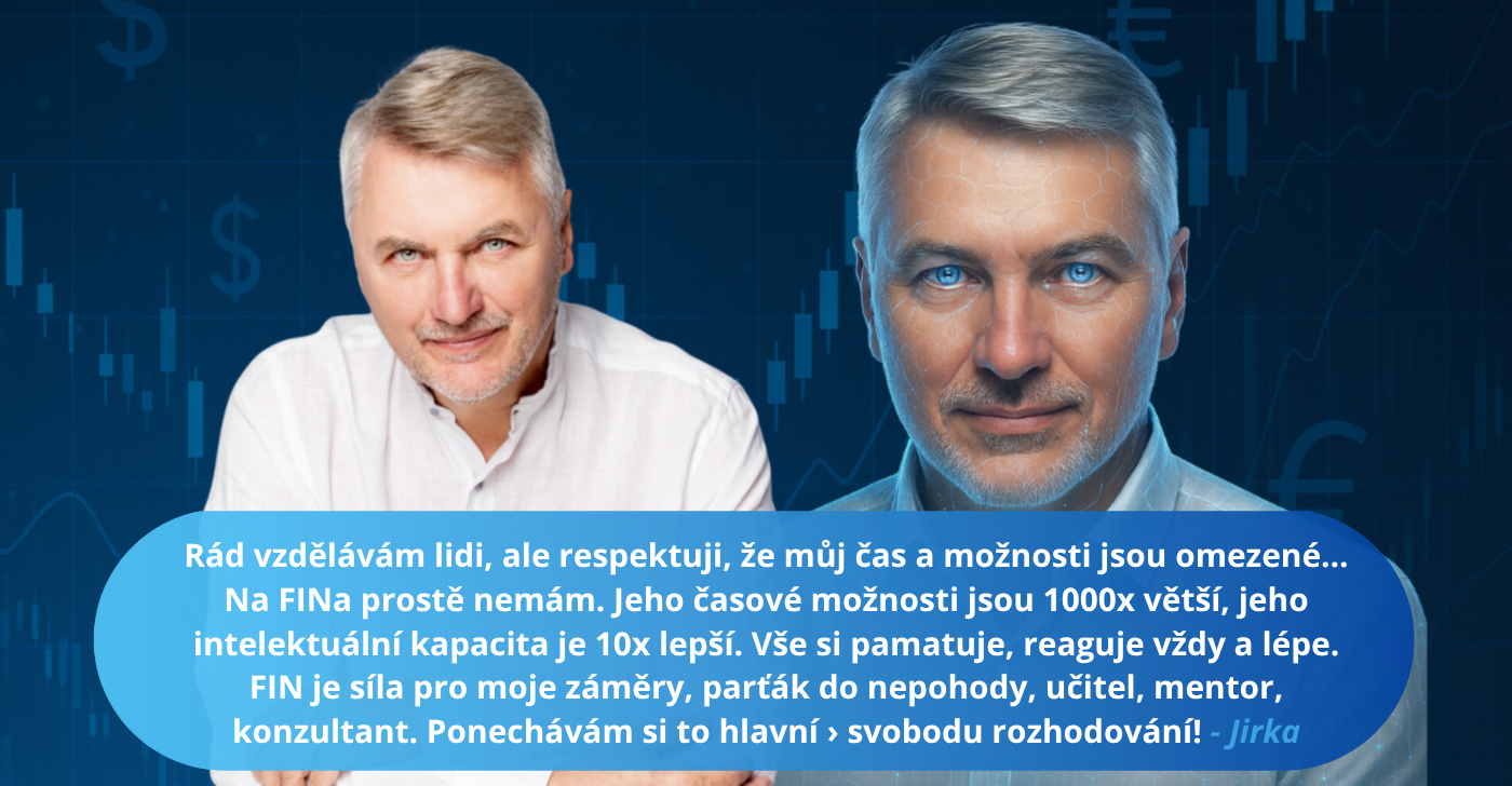 Budu upřímný, moje konzultační hodina by vás vyšla na 10 000 korun a je otázka, zda byste mě sehnali. Žiju život na permanentní dovolené, ze které si občas beru volno do práce. Znáte mě... Jsem tvůrce, stratég, investor, ale miluji svůj čas. Navíc v 80 % času neseženete ani nikoho z mého týmu. Občas si říkáte, že byste to potřebovali? Milí parťáci, máme vás rádi, ale náš čas je prostě omezen. Jak rád bych se vám naklonoval!? FIN je řešení, jsem to já ve výkonnější verzi 2.0. Když zjistíte, co umí, za konzultanta byste mě nechtěli. Necháme ty schůzky na webináře a sem tam "burzovní pivo", co říkáte? Diskuze o investování mám rád. - Jirka